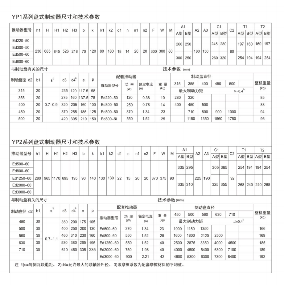 產品介紹:應用:YP1.YP2.YP3系列電力液壓盤式制動器是一種高性能、多功能的先進產品。由于其具有瓦塊退距自動均等,襯墊磨損自動補償等先進功能,使用過程中維護非常便捷。通過增設各種限位開關,可給主機PLC提供所需要的聯鎖保護信號。非常適合各種現代的大型裝卸機械、起重運輸機械、冶金設備、礦山設備及工程機械中各種機構的減速和維持(停車)制動。符合標準:電力液壓盤式制動器符合DIN15435標準和JB/T7020-2006標準。配套符合DIN15430標準的Ed系列推動器。主要特點:▲ 聯鎖退距均等裝置和瓦塊自動隨位裝置,使用過程中可始終保持兩側瓦塊退距均等且無需調整,完全避免制動襯墊浮貼制動盤的現象;▲ 要擺動鉸點均設有自潤滑軸承,使用過程中無需潤滑;傳動效率高,動作靈敏,制動器閉合(上閘)時間為0.25~0.4S;▲ 無級襯墊摩損自動補償裝置,可使瓦塊退距和制動力矩在使用過程中保持恒定,免去經常調整的麻煩;▲ 力矩可調內置式彈簧,設有力矩標尺;▲ 制動襯墊為插裝式,更換便捷。提供半金屬、粉末冶金等多種材質襯墊以適應不同工況;▲ 配套Ed系列電力液壓推動器產品,動作靈敏、使用壽命長;▲ 常閉式設計,(斷電)彈簧制動,(通電)推動器釋放。工作條件:◆ 海拔高度:<2000m;◆ 環境溫度:-20°C?+ 40°C;◆ 相對濕度:≤90%;◆ 工作制:間歇性(S3-60%)和連續(S1);◆ 電源電壓:三相交流,AC380 50Hz (其他電源等級可按需要定制);◆ 有特殊要求時在訂貨時協商確定。基本參數:● 產品型號:YP1、YP2、YP3● 適用盤徑:315~500mm● 制動力矩:280~20000Nm